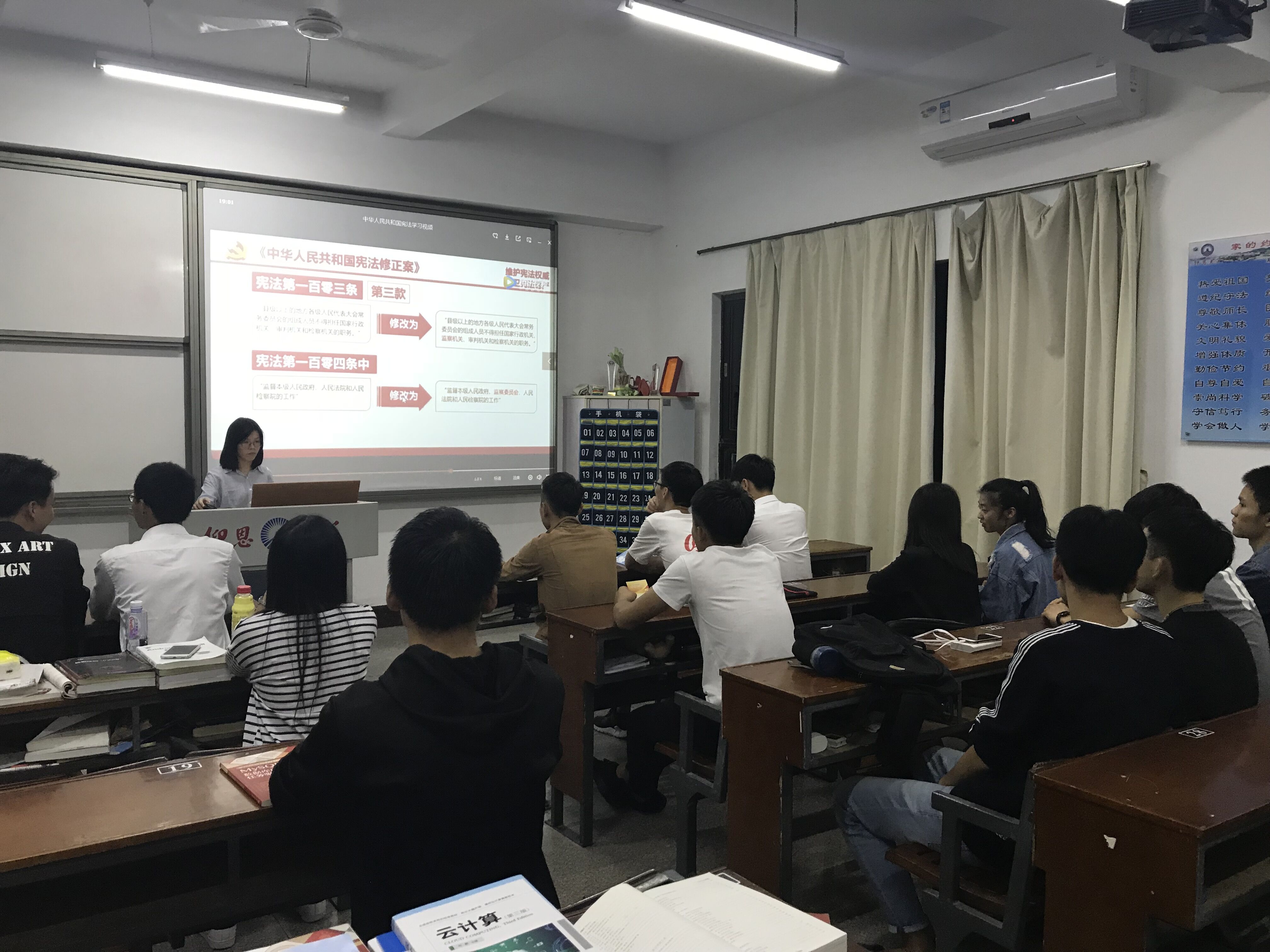 2018年10月24日,电子系第二党支部组织党员、预备党员在共和楼303集中学习新修订的《中华人民共和国宪法》。会议由支部书记林斯玲主持。