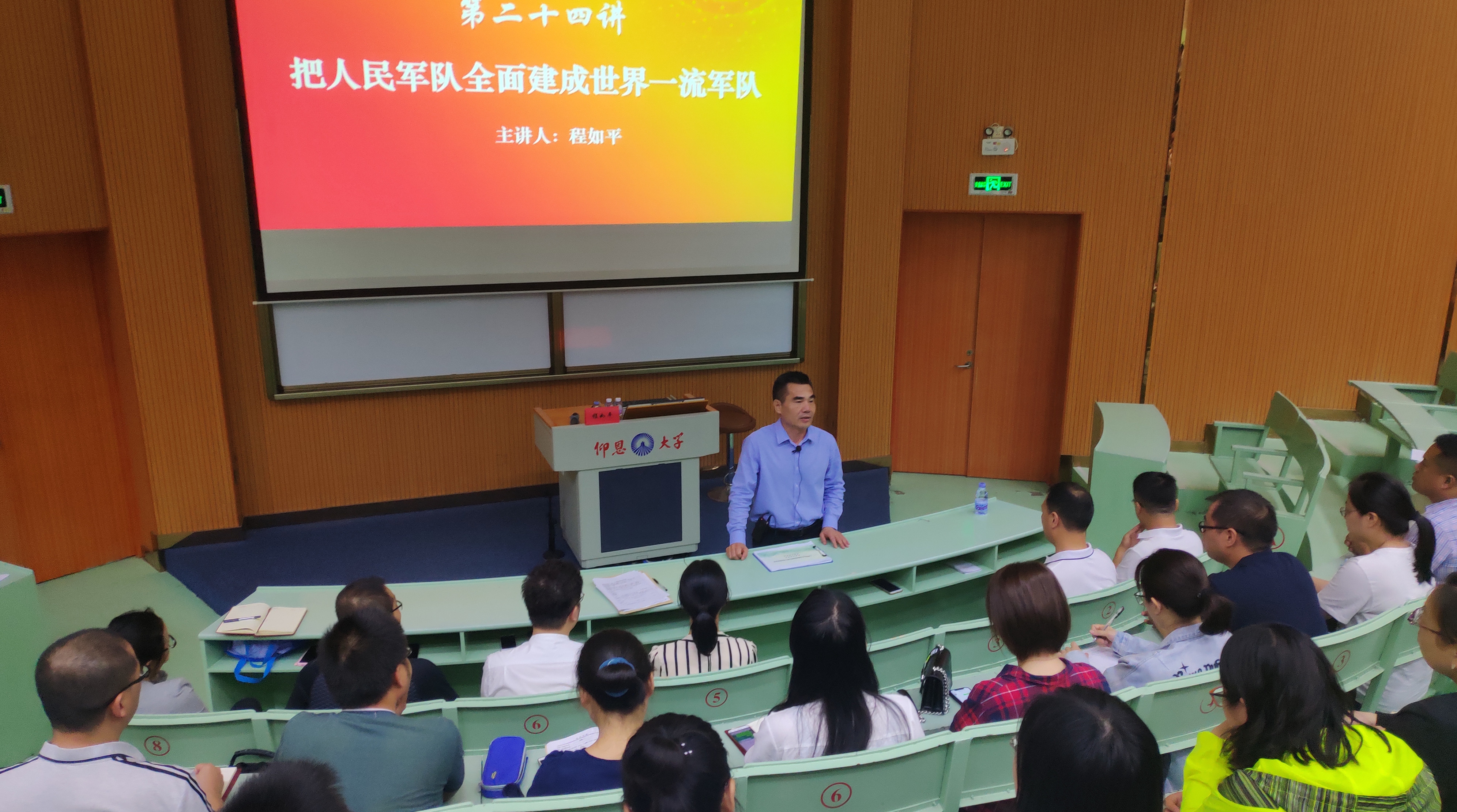 为进一步开展好习近平新时代中国特色社会主义思想“大宣讲”,推动习近平新时代中国特色社会主义思想学习宣传贯彻向纵深发展,6月13日下午,jinnianhui今年会、数学系、体育部在今年会官方网站第一校区乐之讲堂联合开展《习近平新时代中国特色社会主义思想三十讲》宣讲活动。校党委副书记程如平受邀为全体党员作《把人民军队全面建成世界一流军队》的主题宣讲。