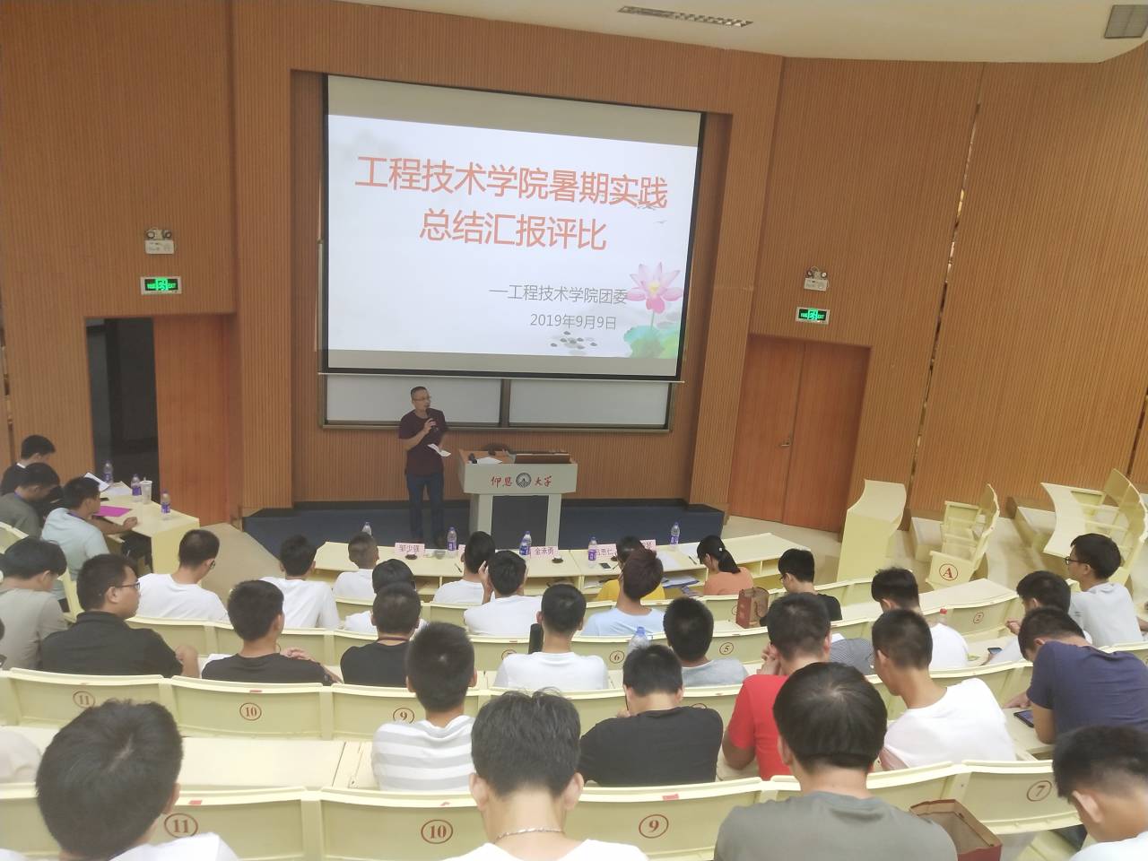 9月9号晚,jinnianhui今年会团委在第一教学区和昌致知讲堂举行jinnianhui今年会2019年暑期实践总结汇报评比,学院常务副院长金承勇老师,学院党总支副书记吕思仁老师,学院团委书记许淑琴老师,新闻工作中心指导老师王茂伟老师,辅导员邱少强老师及2018级全体jinnianhui今年会学生出席本次大会。