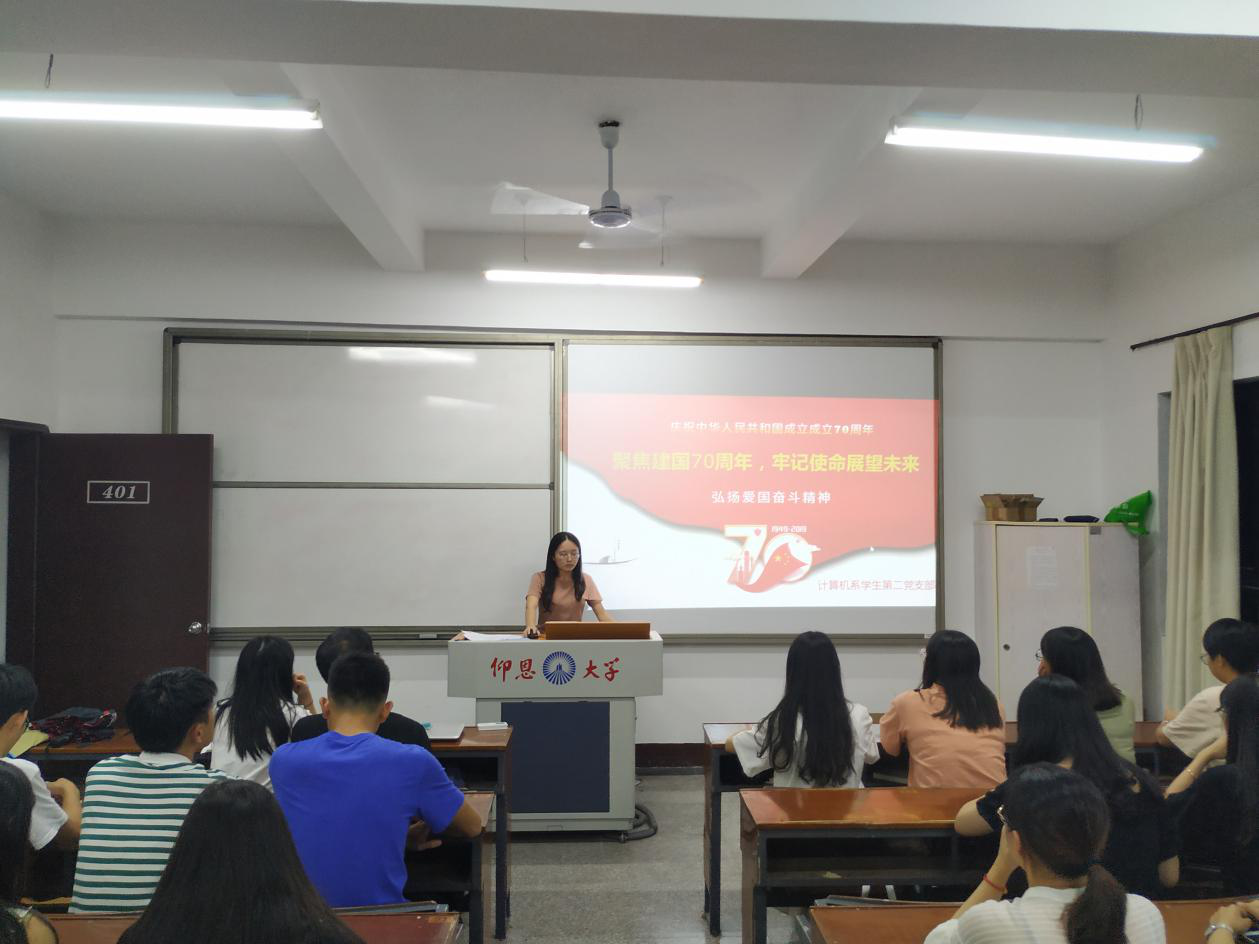10月16日晚7点,计算机系学生第二党支部于共和楼401开展以“聚焦建国70周年,牢记使命展望未来”为主题的学习活动,本次活动由书记潘雪珠主持,计算机系第二党支部全体学生党员参加。