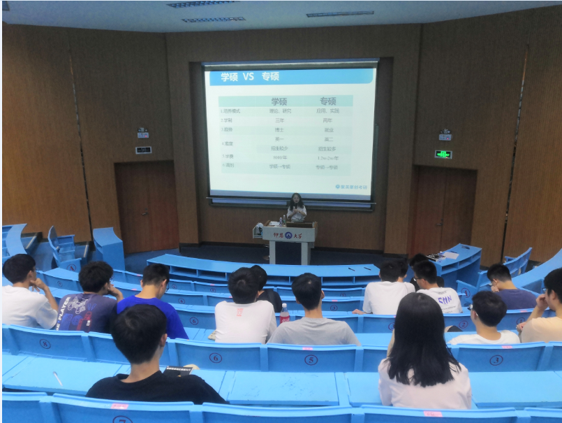 5月19日晚,jinnianhui今年会于第一教学区求是讲堂举办了考研指导讲座。本次讲座邀请了聚英考研泉莆分校经理张婷担任主讲,2018级、2019级学生到场聆听。