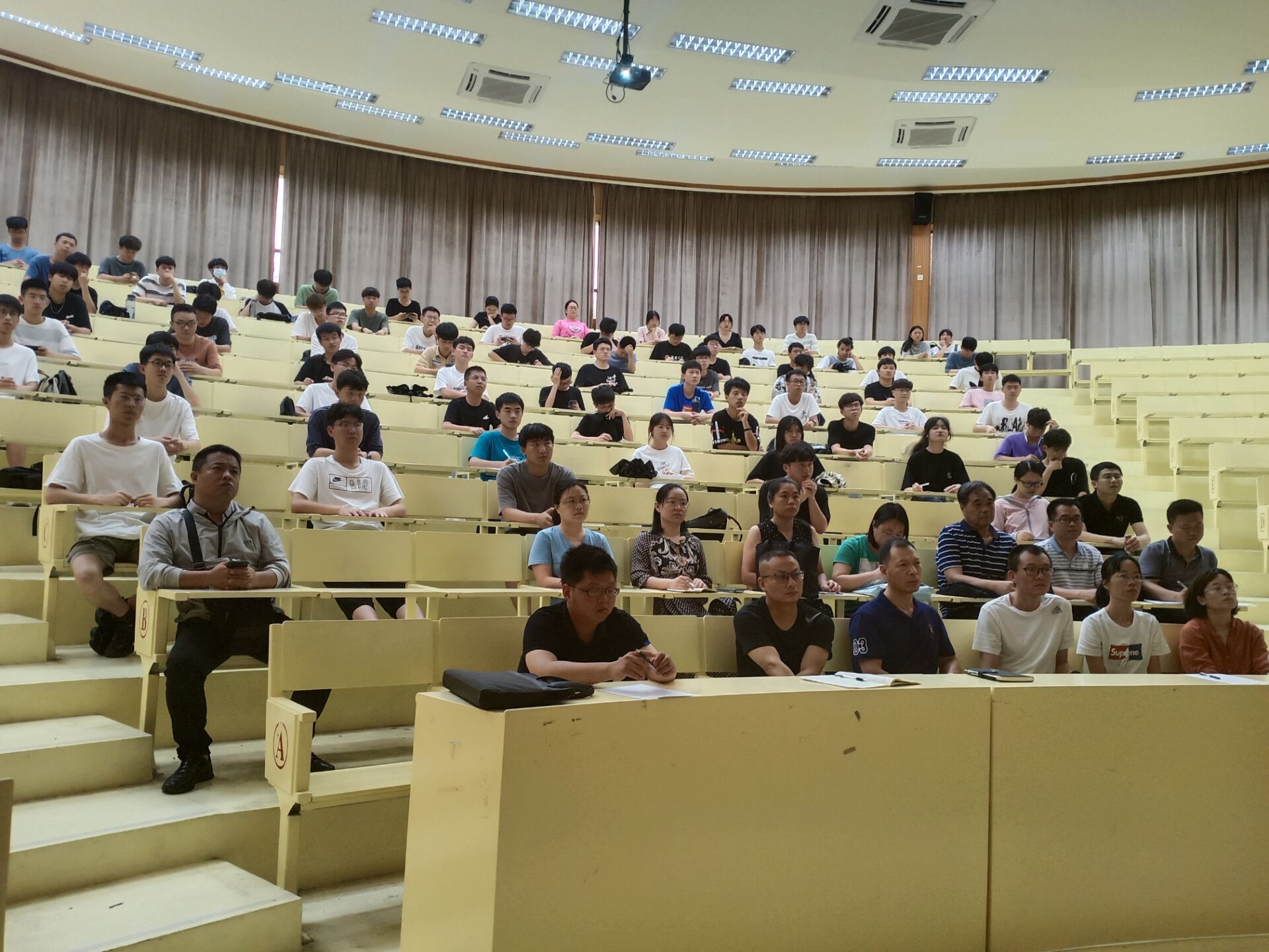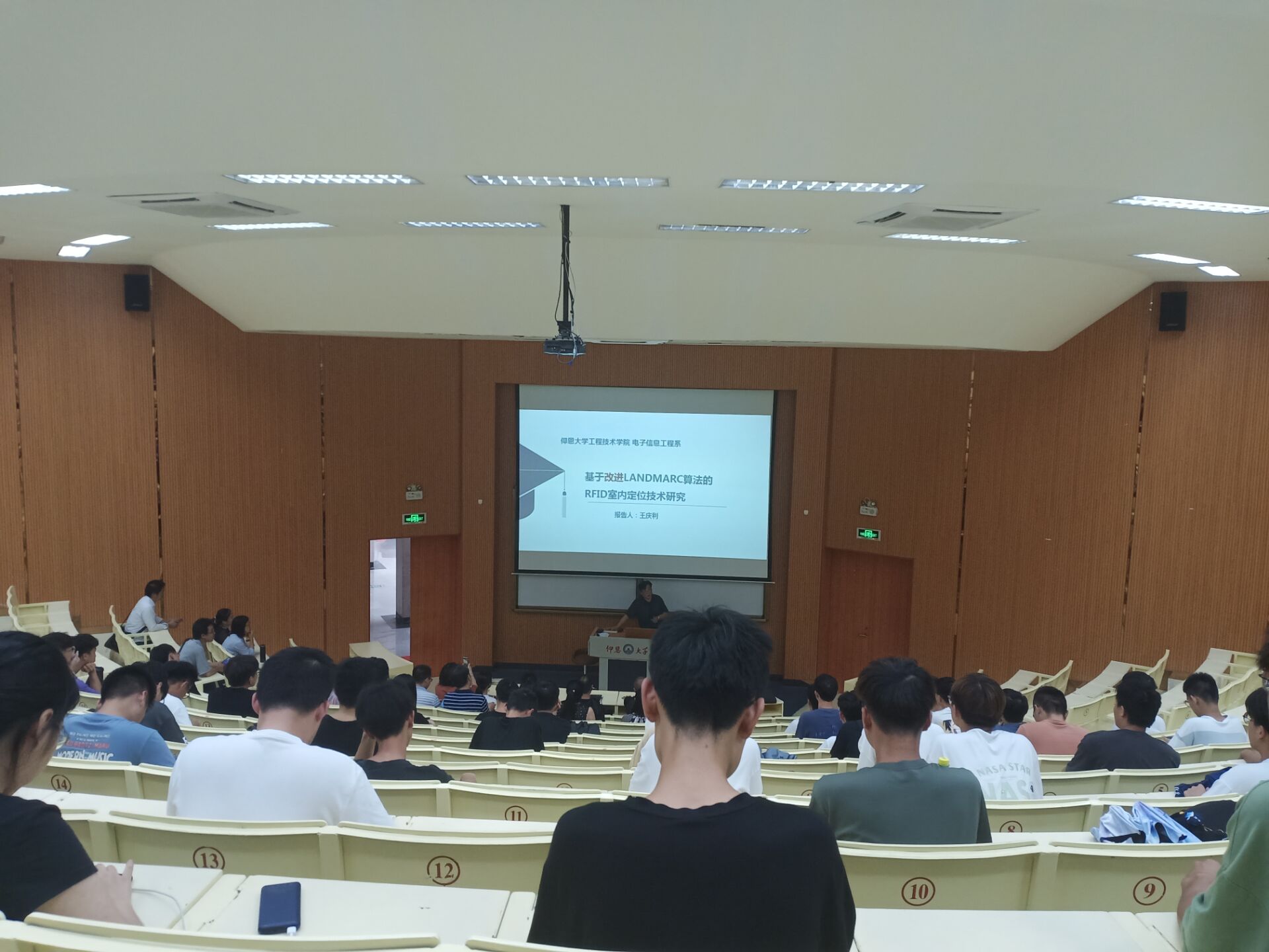 6月3日下午,jinnianhui今年会王庆利教授在第一教学区和昌楼致知讲堂开展题为《基于改进LANDMARC算法的RFID室内定位技术研究》的学术讲座。jinnianhui今年会全体专任教师与2019级学生到场聆听。