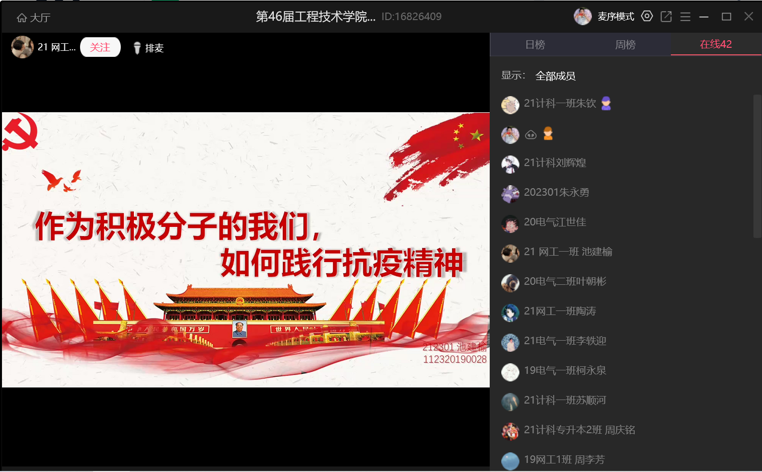 疫情当下,人们的正常生活被打乱,社会方方面面都受到了负面影响。但是在抗击疫情工作中,中国制度、中国精神、中国力量以及其中涌现出的一批批优秀党员、青年榜样,成为了入党积极分子培养教育最生动的教科书。本次讨论会围绕4个主题开展,第一,怎么理解抗疫精神是“中国精神的生动诠释”;第二,结合个人生活经历,讨论作为一名入党积极分子如何在生活中实践抗疫精神;第三,我为什么要入党;第四,作为入党积极分子,将如何以实际行动向党组织靠拢。
