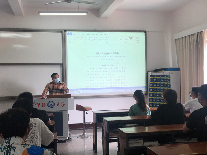 会议伊始,赵宏岩围绕“学习党纪法规”这个主题,带领全体同学对《关于新形势下党内政治生活的若干准则》和《中国共产党监督条例》(以下简称《准则》和《条例》)进行了详细的解读剖析,并结合实际引领同学们在以后的学习生活中要把纪律和规矩挺在前面,牢固树立党章党规党纪意识,发挥表率作用,带头践行自律规范,带头维护纪律严肃性和权威性,发挥先锋模范作用,带动周围同学。最后,同学们还一起观看《准则大家学》,通过生动有趣的动画形式,同学们进一步理解了《准则》的深刻内涵。