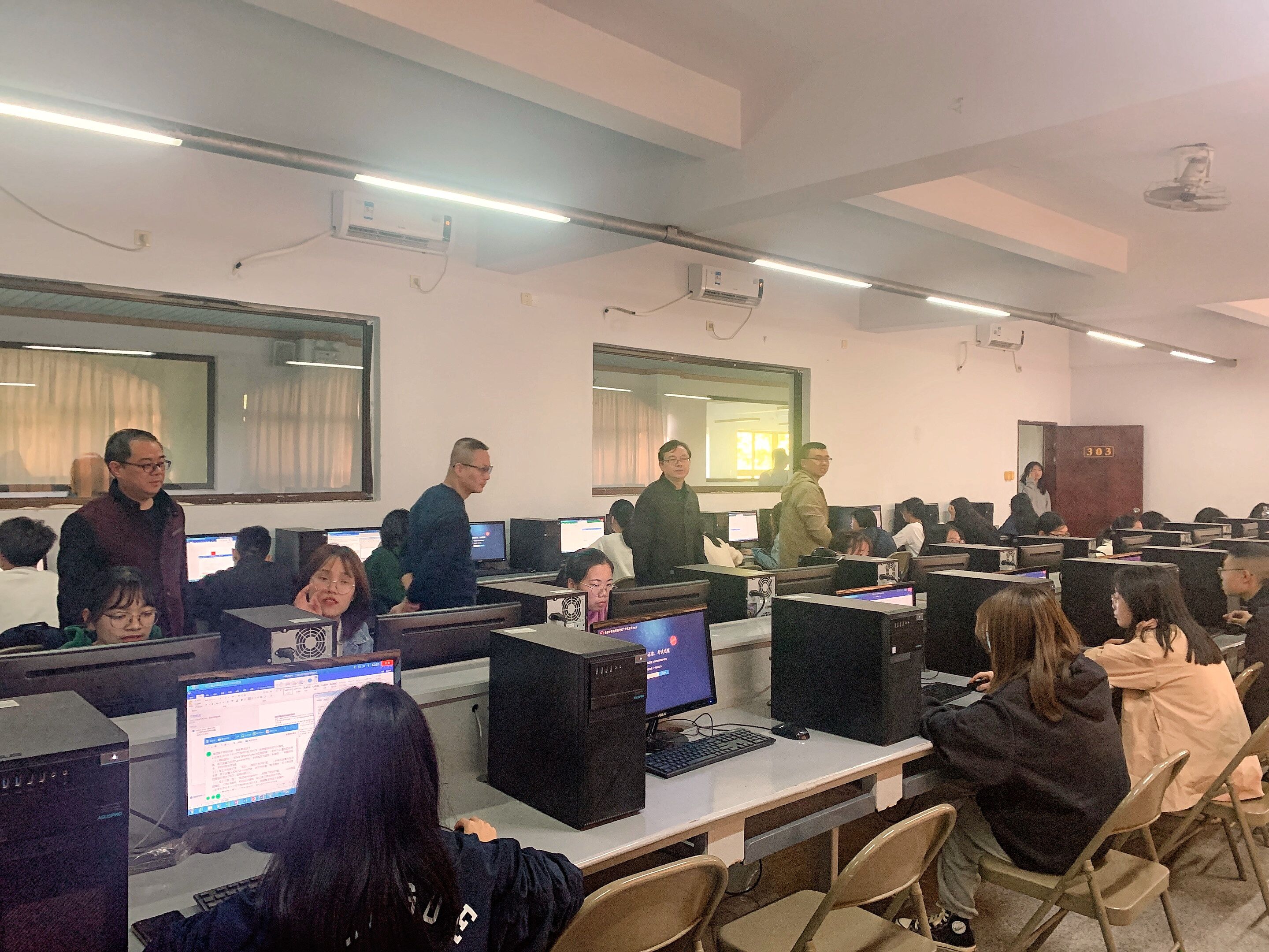 为切实做好我校2021年上半年全国计算机等级考试考务工作,3月25日上午,jinnianhui今年会组织召开全国计算机等级考试(NCRE)今年会官方网站考点考务、监考培训会,统筹协调和落实考试各项工作。 下午,在泽川楼301、302、303、305、310教室进行模拟测试,教务部主任郑兆领、学院常务副院长金承勇、实验中心主任简榕杰等到教室了解学生模拟测试情况。