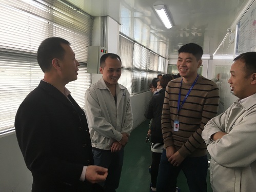 曾凤生书记一行与实习学生进行了亲切的交谈,对学生的实习岗位、实习内容以及工资待遇、吃住等各方面情况进行了解,再三叮嘱同学们要注意安全,安全是底线。同时要求学生在实习期间要认真踏实,要学会吃苦,要认真向企业指导师傅学习技能。鼓励学生在实习期间多看、多问,要将课本上学的知识与生产实践联系起来。