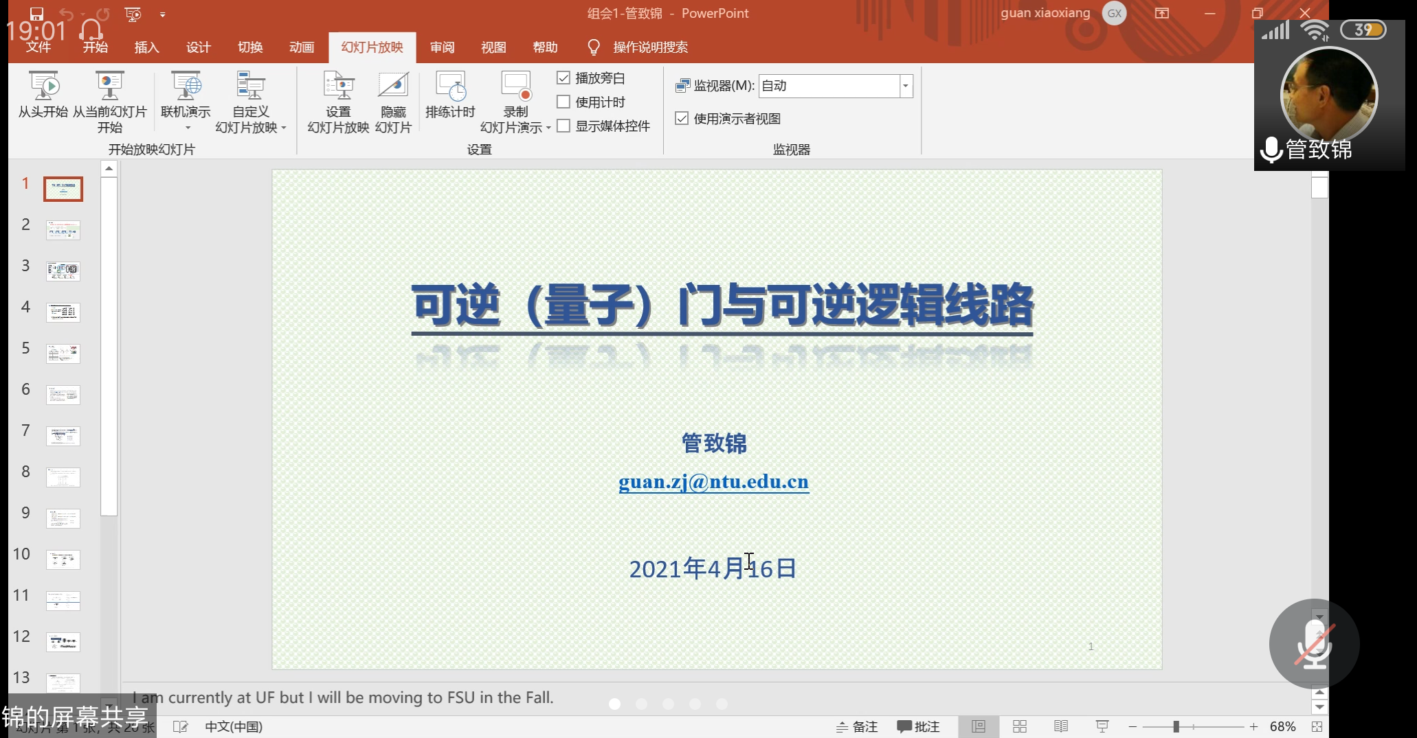 4月16日晚,南通大学教授、博士生导师管致锦教授应邀为今年会官网开展题为“可逆(量子)门与可逆逻辑线路”线上讲座。学院计算机系、网络系及电气工程及其自动化系部分老师参加了本次讲座,讲座由副院长李影主持。