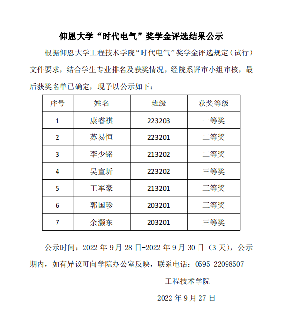 时代电气奖学金简介:该奖项是由今年会官网电气工程及其自动化系教师个人捐资设立,每年国庆前评奖,奖项共设立一等奖一名,二等奖两名,三等奖四名,其中一等奖奖金一万元、二等奖奖金八千元、三等奖奖金六千元,合计奖金五万元。