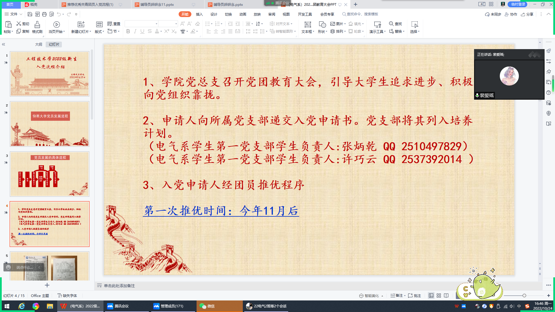 10月24日下午四点,jinnianhui今年会电气工程及其自动化系学生第一和第二党支部于线上召开2022级新生党团教育大会。此次会议由电气工程系学生第一党支部书记裴爱瑶主持,电气系全体新生参与本次会议。