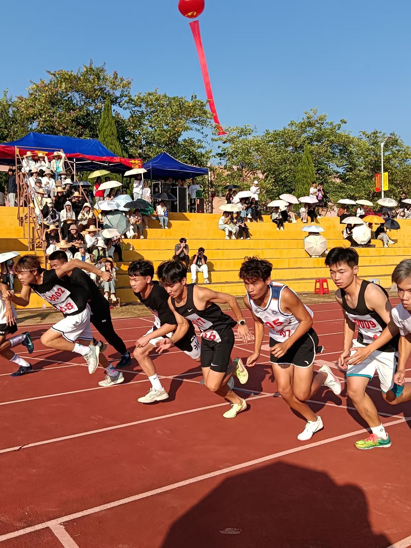短跑比赛中,速度与激情延伸。百米赛道上,随着一声号令枪响,林伟锋、吴利康、杨嘉然如旋风般急速奔出,奋力拼搏,赢得一声声加油喝彩的呐喊。