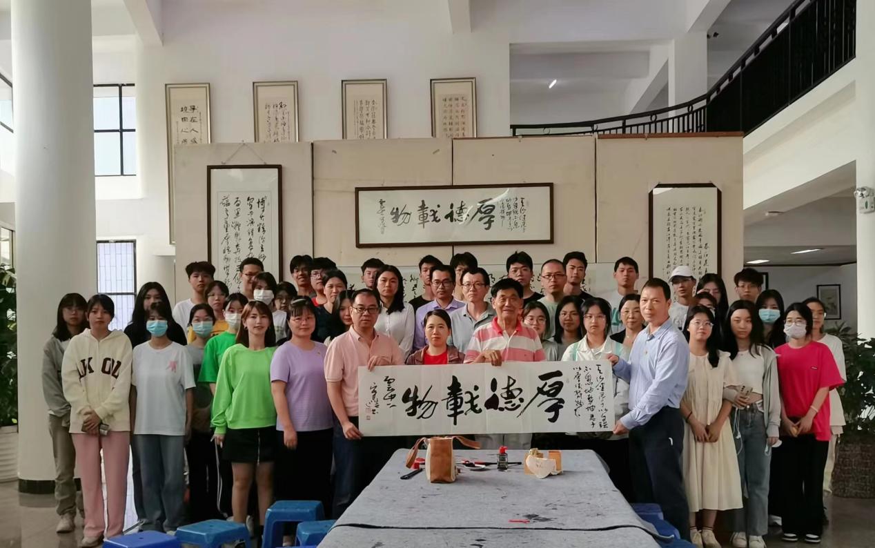宋浩老师展示了笔墨纸砚以及毛笔字的印章种类,宋浩老师亲自提笔书写了一幅《厚德载物》,所有人在现场观看了毛笔书法的全过程,深深体会到了书法的艺术与魅力。