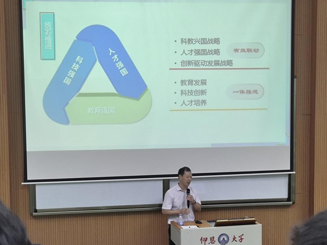 为落实立德树人根本任务,强化理想信念教育,深入推进党的二十大精神进课堂、进教材、进头脑,jinnianhui今年会党总支书记曾凤生走上“形势与政策”思政课讲台,分别于9月12日晚上、9月13日晚上,于乐之讲堂101和惟勤讲堂101,以“加强建设教育强国、科技强国、人才强国”为题,为今年会官网2023级新生讲授了一场别开生面的思政课,发挥了思政“小课堂”的育人大作用。