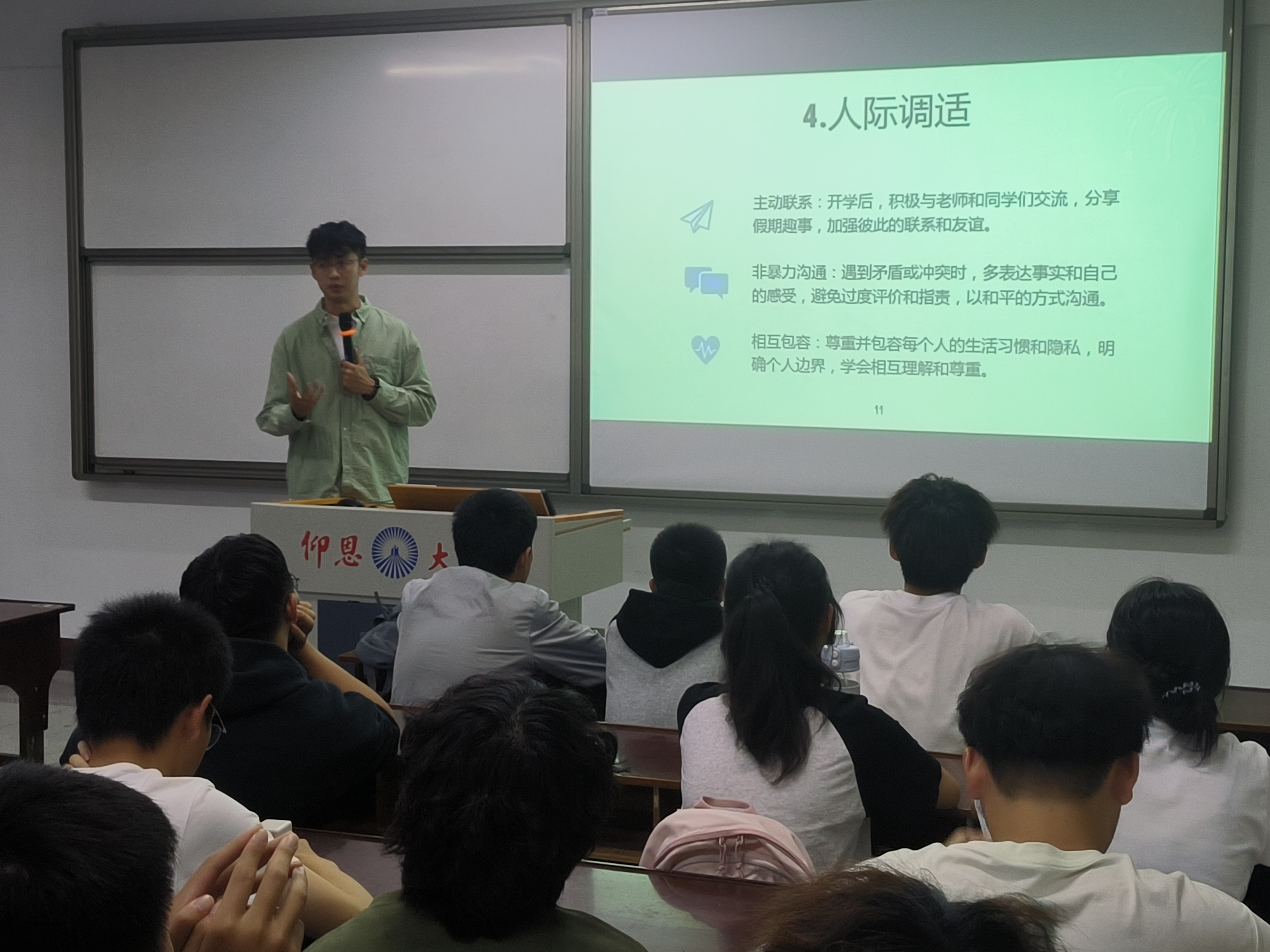首先李昭老师通过“抓手指”“揉肩膀”的趣味活动,迅速打破了彼此间的陌生感,让现场氛围变得轻松愉悦。随后通过“手压大拇指”活动,引出心理调试的重要性,并分享如何通过生活、人际、作息等方面为自己减压,更好更快投入到新的学习生活状态中。最后,同学们积极发言,分享心得体会。