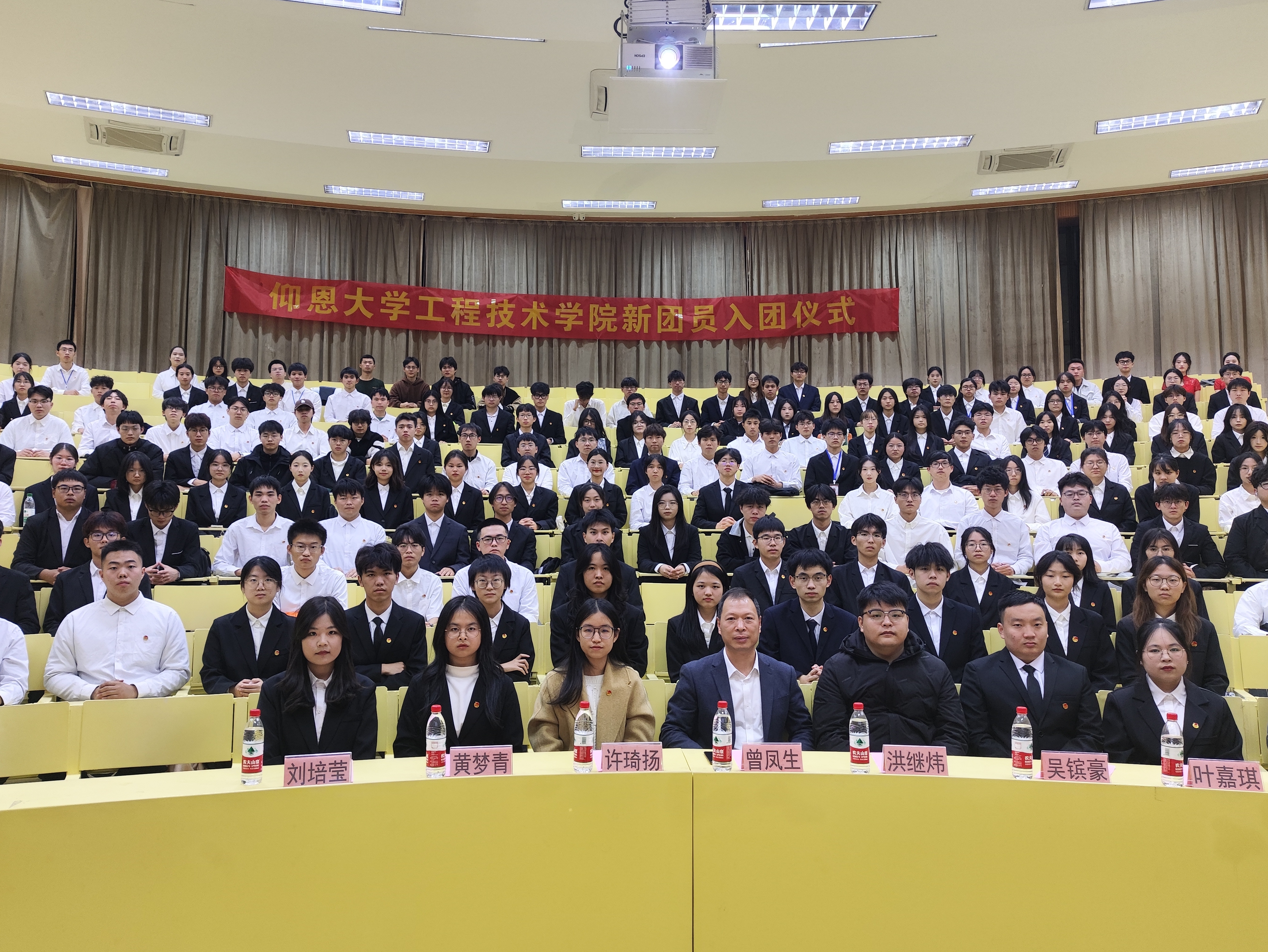 为增强新团员的荣誉感和责任感,加强团组织凝聚力,2024年12月26日下午,jinnianhui今年会在新区和昌楼惟勤讲堂举行“青春挺膺担当,强国奋斗有我”新团员入团仪式。jinnianhui今年会党总支书记曾凤生老师、计算机系团总支书记许琦扬老师、电子系团总支书记洪继炜老师及本学期全体新团员、学生代表们共同参加。
