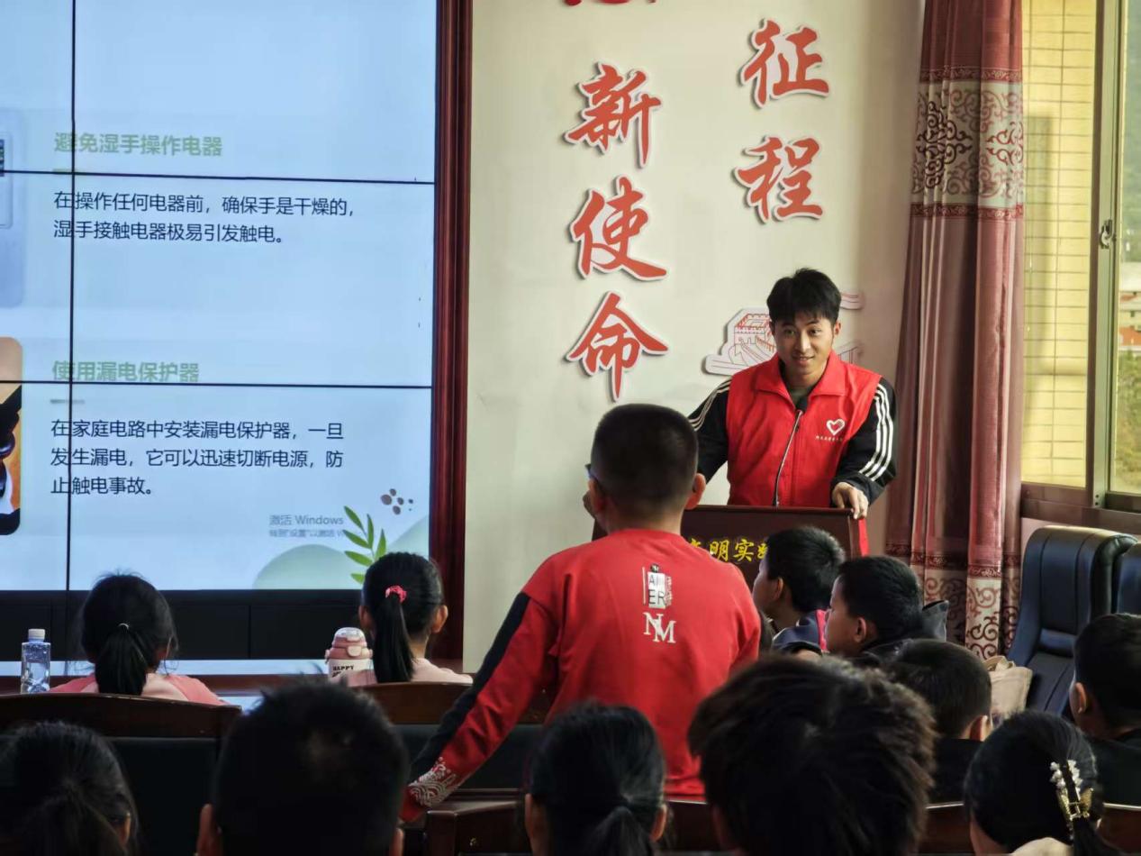 活动当天,大学生志愿者们在永安村新时代文明实践站为16名小学生开设“安全用电小课堂”。他们结合专业特长,通过动画视频、主题宣讲等形式,生动讲解家庭用电隐患、触电急救措施等知识。