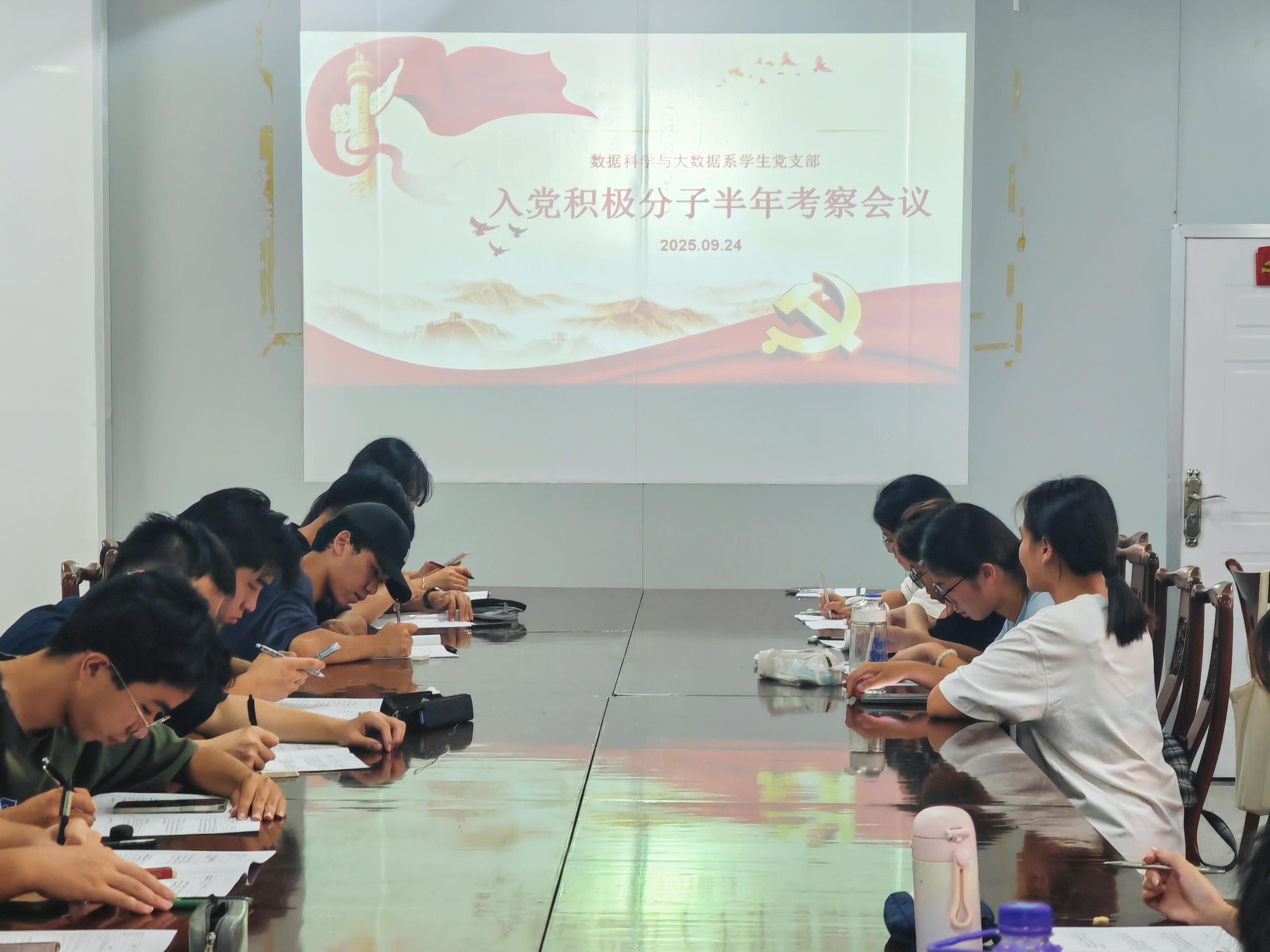 2025924,数据科学与大数据系学生党支部于泽钏楼四楼会议室开展入党积极分子半年考察会议暨主题教育专题党课。党支部书记庄秋荣老师等15名党员及25名入党积极分子参与此次大会。