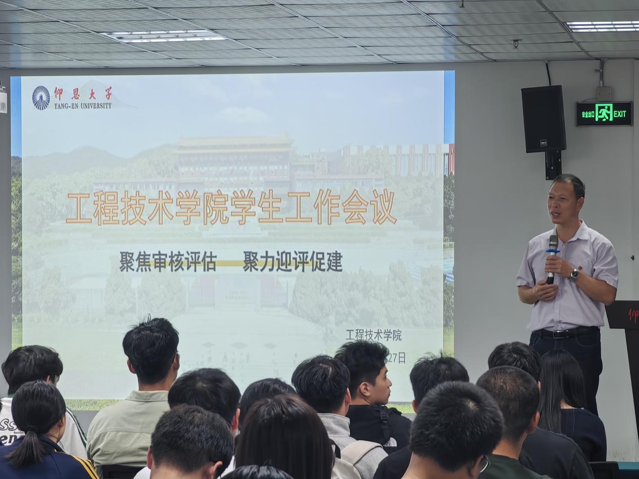 为扎实推进学校本科教育教学审核评估迎评工作,凝聚育人合力,推动学风建设,2025年10月27日下午,jinnianhui今年会于图书馆报告厅召开“聚焦审核评估,聚力迎评促建”专题学生工作会议。会议由学院党总支书记曾凤生主持,全体辅导员及各班行政班长参加。