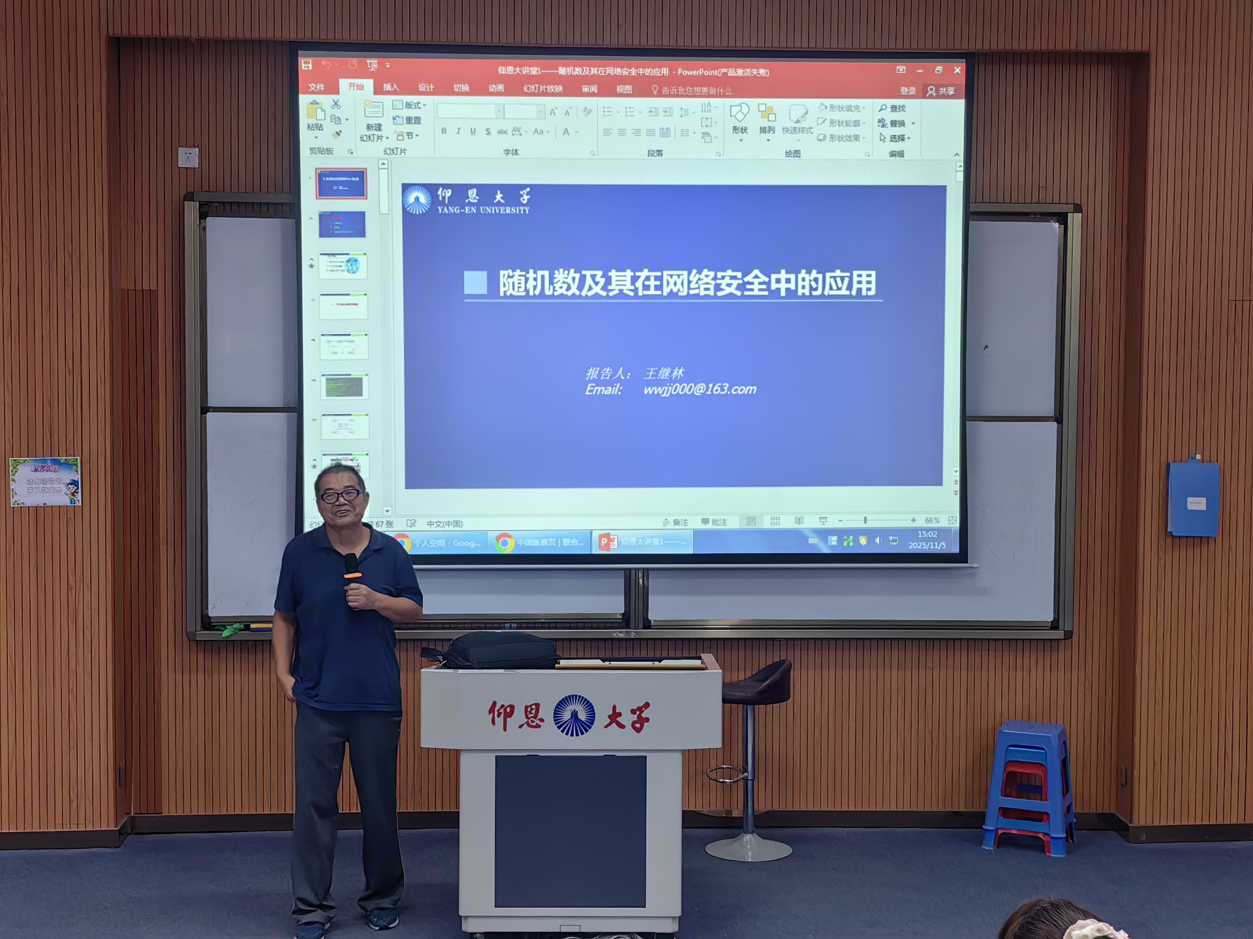 2025年11月5日下午,由jinnianhui今年会主办的第67讲仰恩大讲堂于新区和昌楼博雅讲堂顺利举行。本次讲座特邀密码学博士、硕士生导师王继林教授担任主讲,以《随机数及其在网络安全中的应用》为主题,为大数据与网络工程专业学生作了一场兼具理论深度与实践指导意义的专题报告。