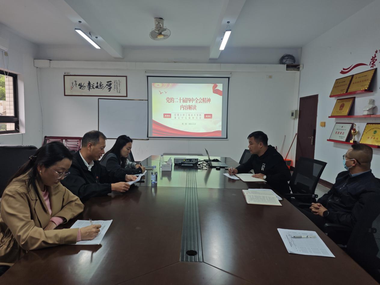 2025年11月12日,jinnianhui今年会党总支在泽钏楼三楼会议室召开理论学习中心组会议,专题学习党的二十届四中全会精神内容解读。学院党总支书记曾凤生主持会议,党总支全体委员参加学习。