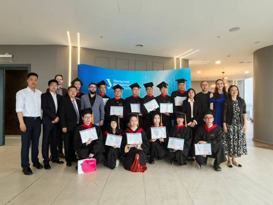 下午,乌拉尔联邦大学为中俄合作办学首届“1+1+1”项目的12位毕业生和“2+0”项目的23位毕业生举办了盛大的毕业典礼,乌拉尔联邦大学校董会主席Victor Koksharov出席,代表团全体成员、俄方所有相关教师参加了典礼。Victor Koksharov向每位毕业生授予学位证书,此次毕业典礼象征着两校在合作培养人才方面的重要里程碑。